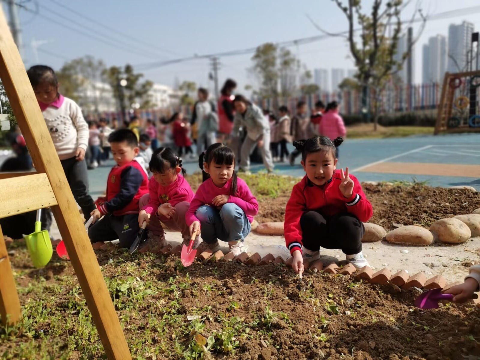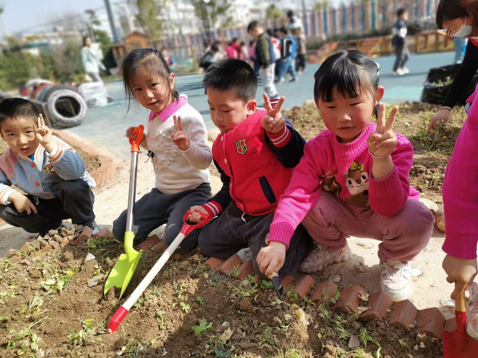 学前教育专家陈鹤琴先生说:"大自然是我们的知识宝库,大社会是我们的生活宝库,也是我们的活教材。"为了让孩子们亲近大自然、发现大自然植物生长的奥妙、体验种植的乐趣,今天上午我们组织了幼儿亲手种植蔬菜活动。老师先在班级给小朋友们普及了种蔬菜方法以及蔬菜的生长过程,孩子们都已经跃跃欲试的等不及了!准备好工具,我们出发了!